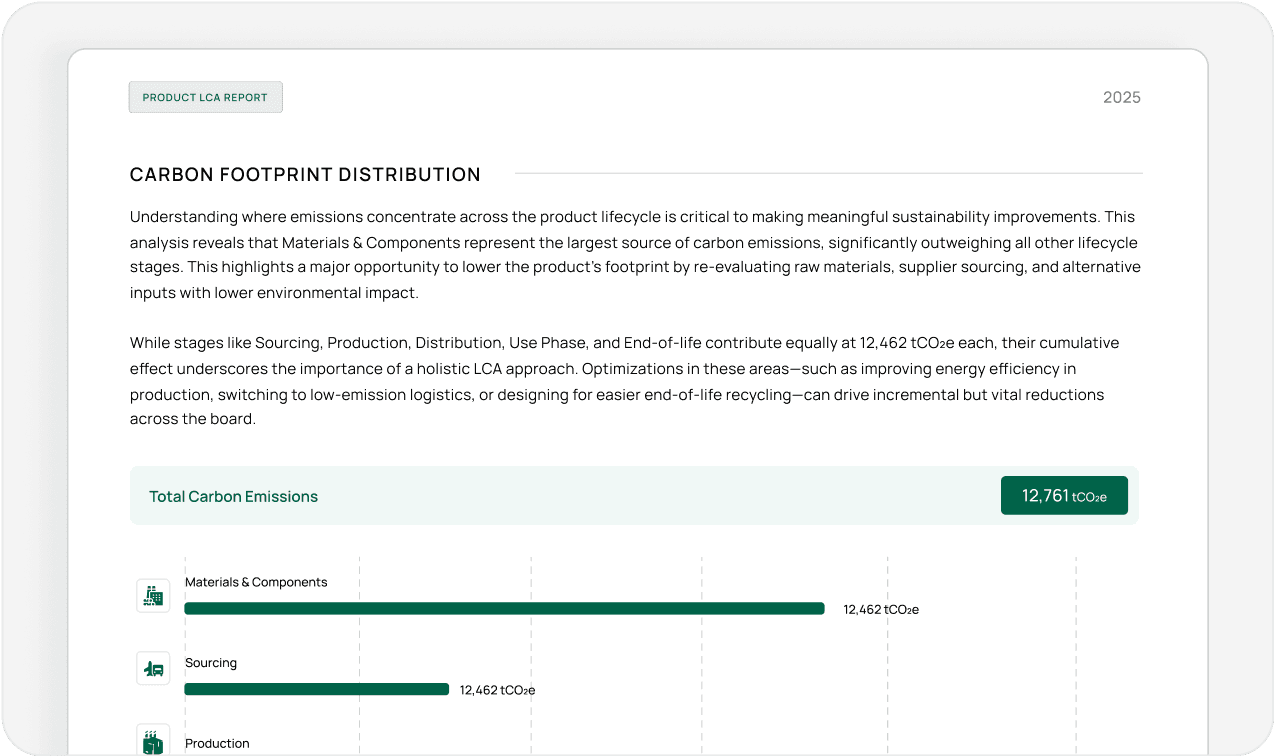 Genera istantaneamente report conformi a ISO 14044, GRI, CSRD e altri standard.